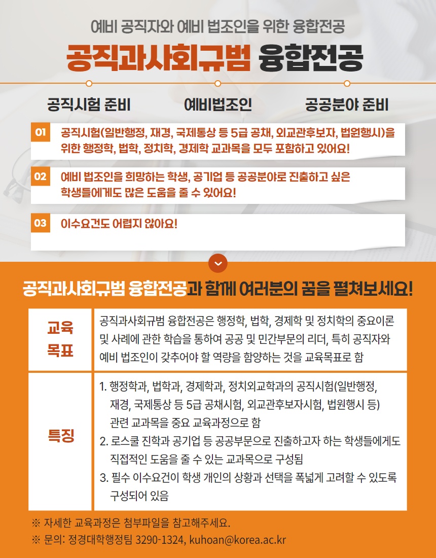 <공직과사회규범 융합전공 전공설명회> - 일시: 2025. 11. 17. (월) 오후 7시~9시 - 장소: 상남 정경관 508호 천신일홀 - 내용: 1. 융합전공 설명 (임현 전공 주임교수) 2. 법학공부와 법조인으로서의 진로에 대한 특강 (한국외국어대학교 법학전문대학원 이재훈 교수)